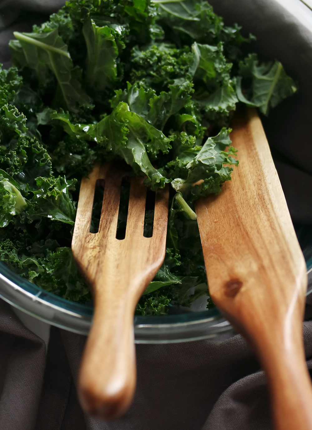 - In a large mixing bowl, massage 1 tbsp oil into the leaves of the kale. Really work it.