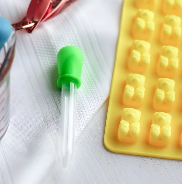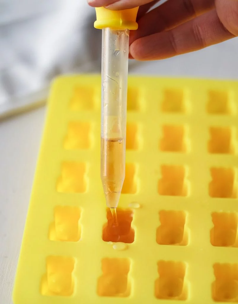- Using the droppers provided, fill each gummy hole with the agar wine mixture.