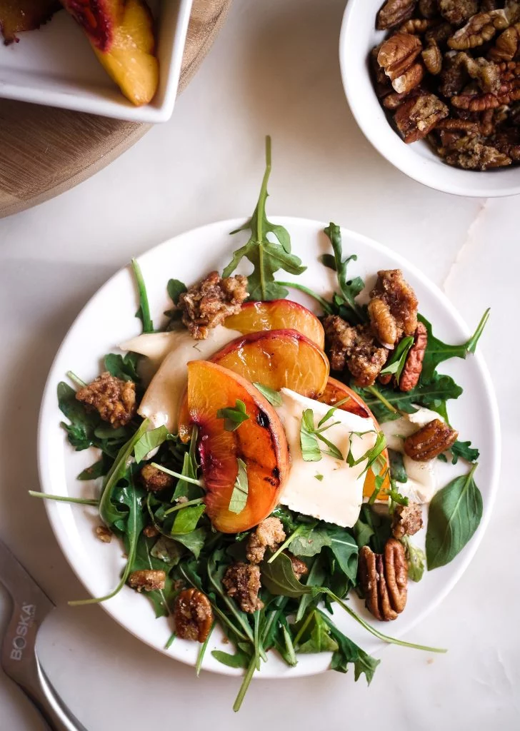 - Layer warm peaches, hunks of brie and basil over a bed of lettuce or greens.