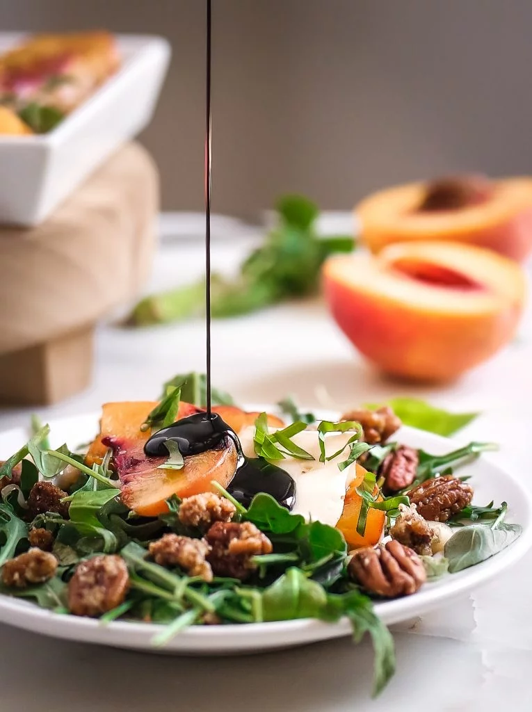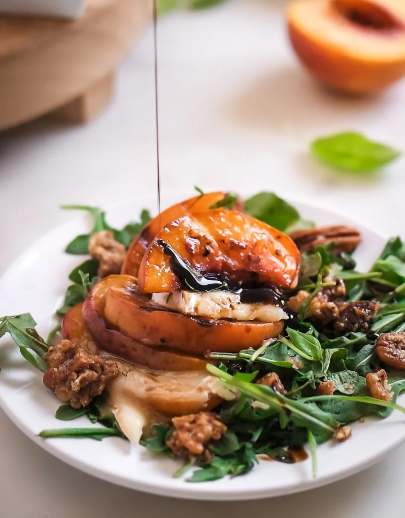 Grilled Peach ๐ Brie & Basil Salad with Sweet Balsamic Reduction