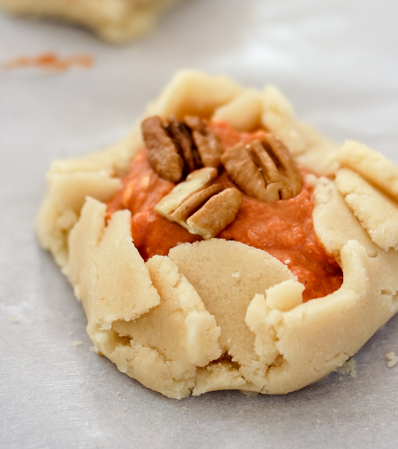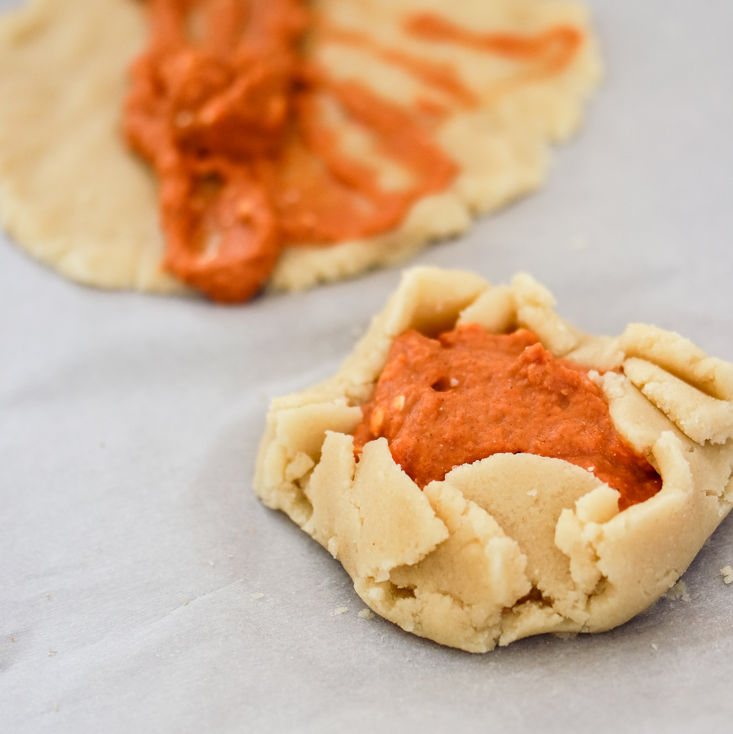 Fill with the pumpkin mixture and fold the edges up and over.