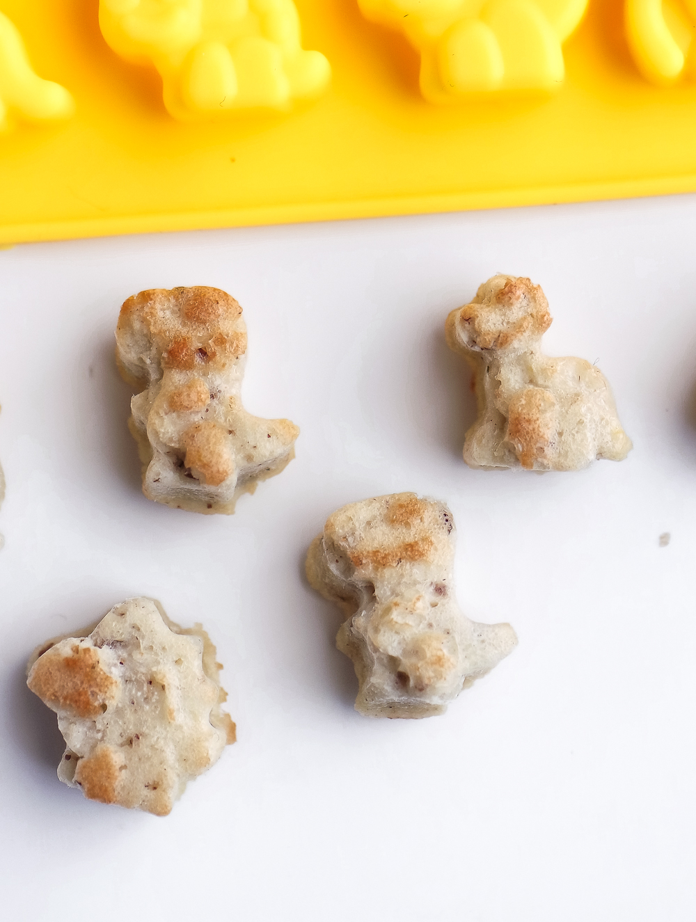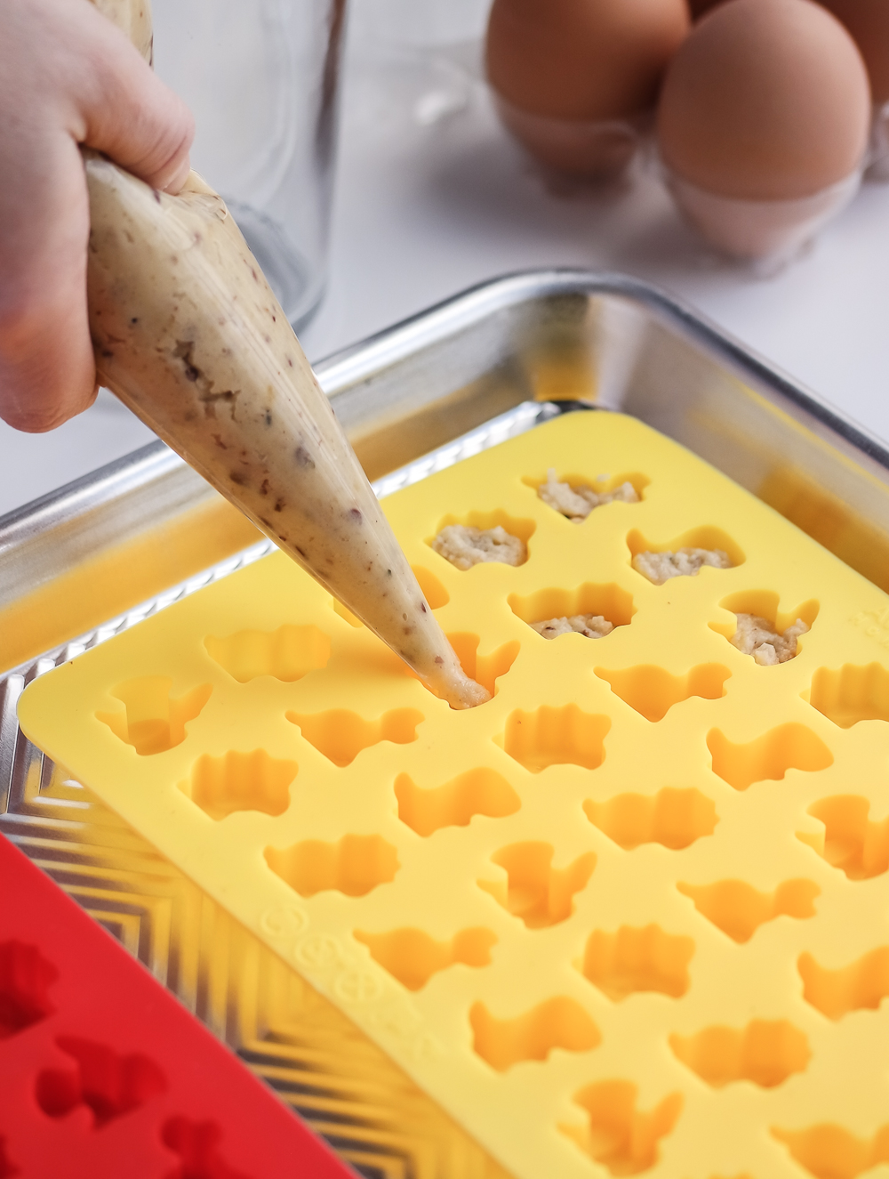 - Heat oven to 350 and place silicone dinosaur molds on a baking sheet.