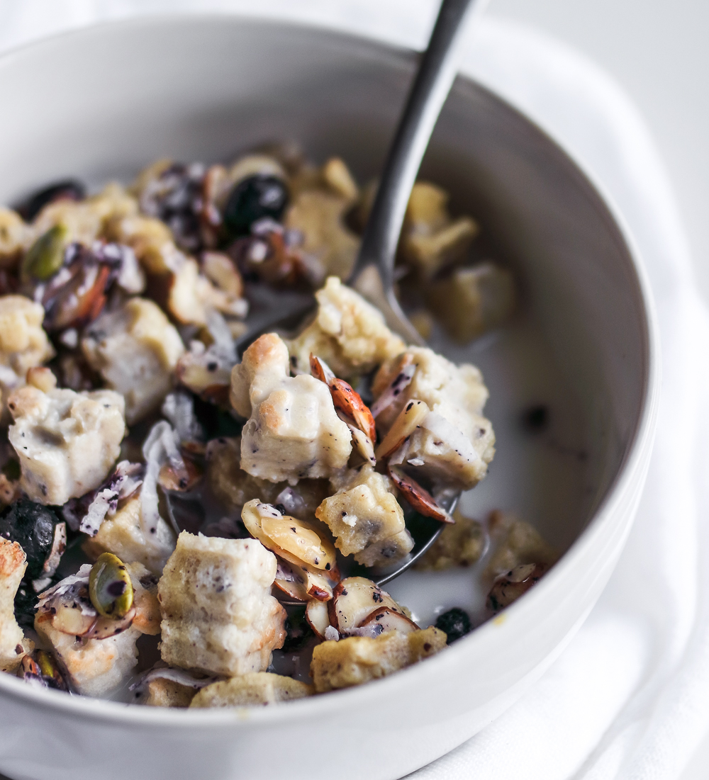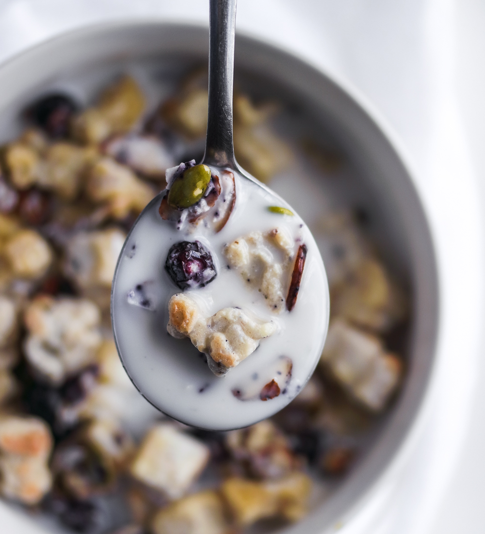 This is *part two* of the two-parter recipe! If you missed part one, it was the Blueberry Almond Granola that you see floating around in this prehistoric dish of deliciousness. Check it out, PIN IT, then come back over here and pin this one so you can bake and make healthy, low carb cereal. Deal?