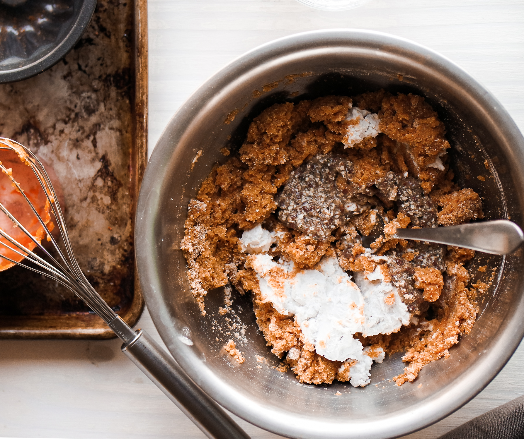 This recipe is a base of coconut cream, coconut flour, pumpkin purée, spice, and a flax egg.