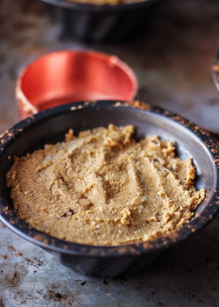 It’s less like batter and more like a crumbly dough you press into the mini pans.